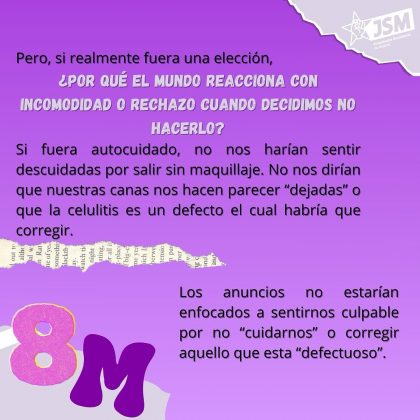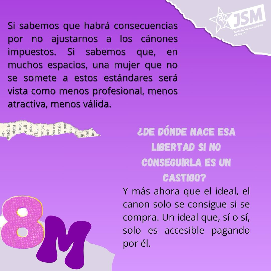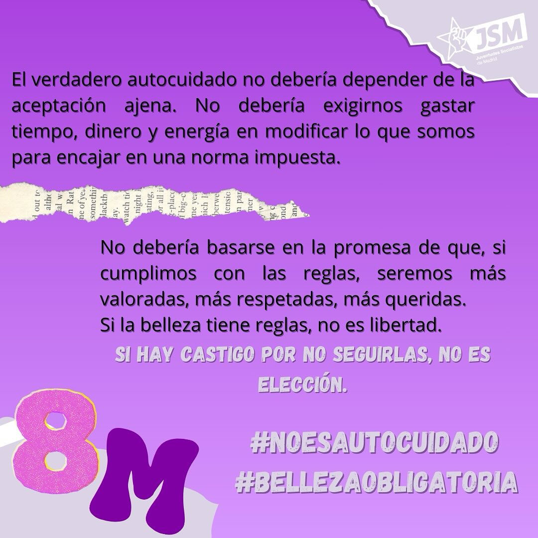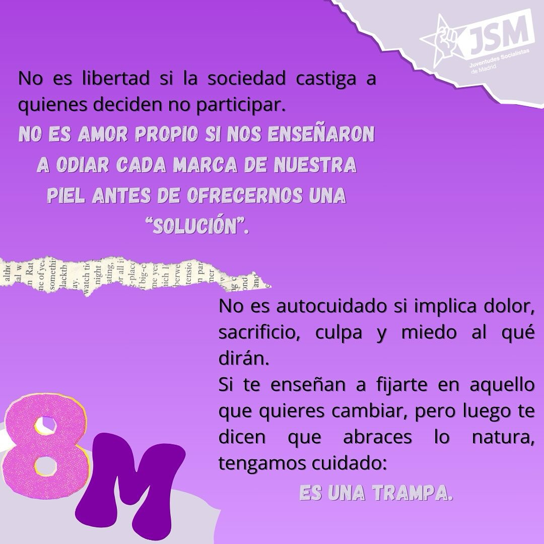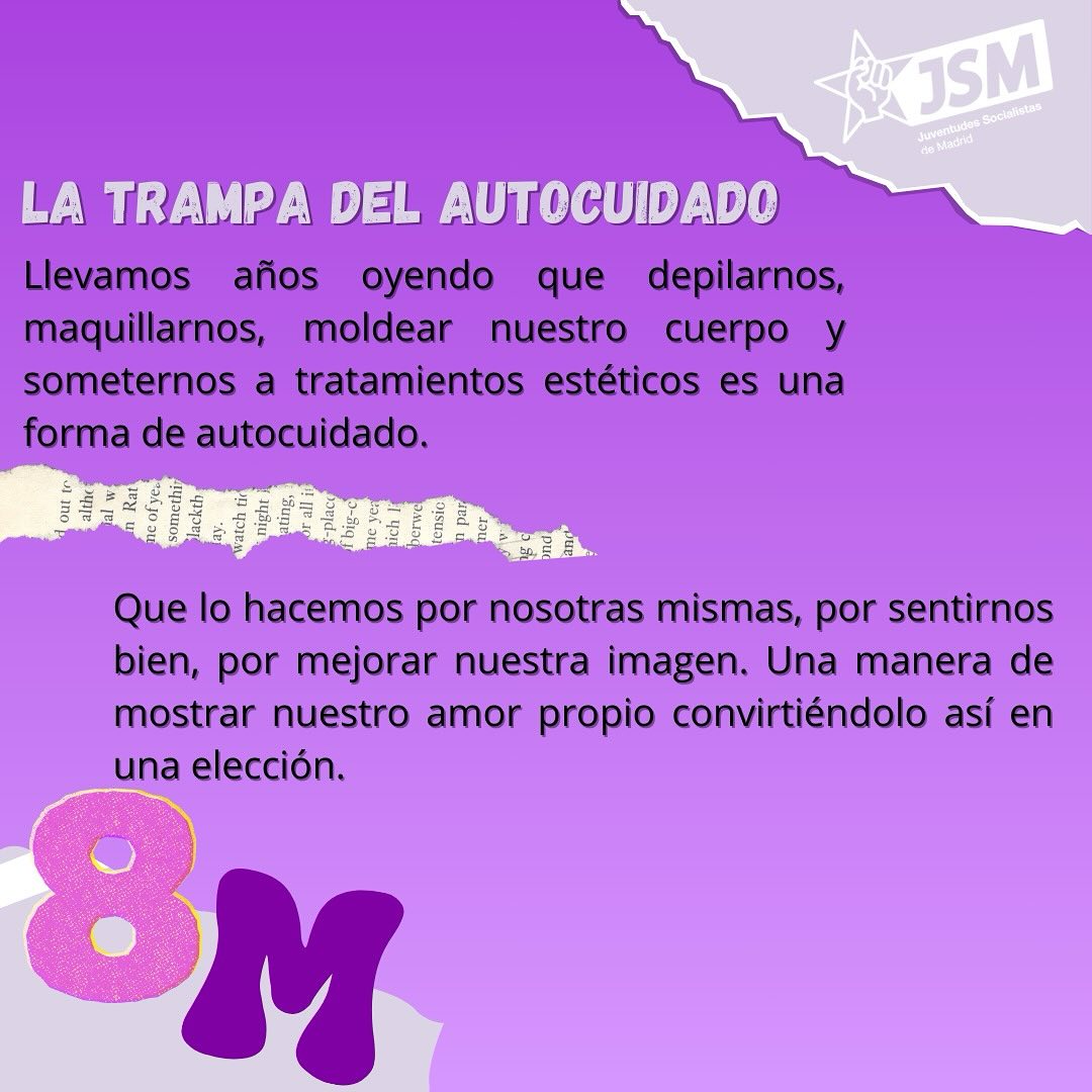Juventudes Socialistas de Madrid presenta su campaña con motivo del Día Internacional de la Mujer, que se conmemora el próximo 8 de marzo. La organización pone el foco en la trampa del “autocuidado”, definiéndola como belleza obligatoria.