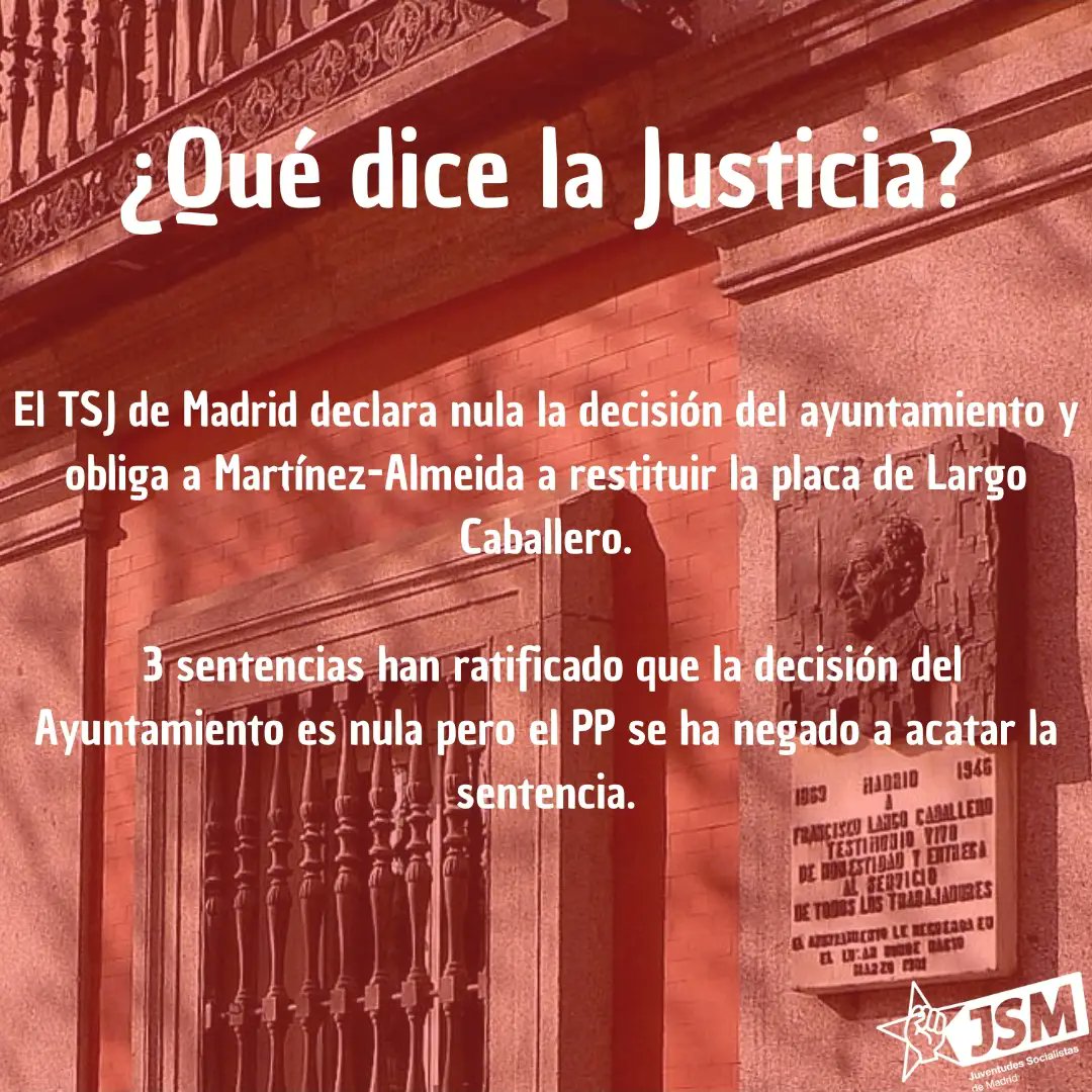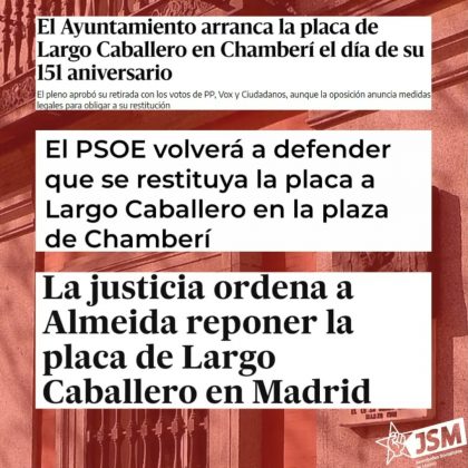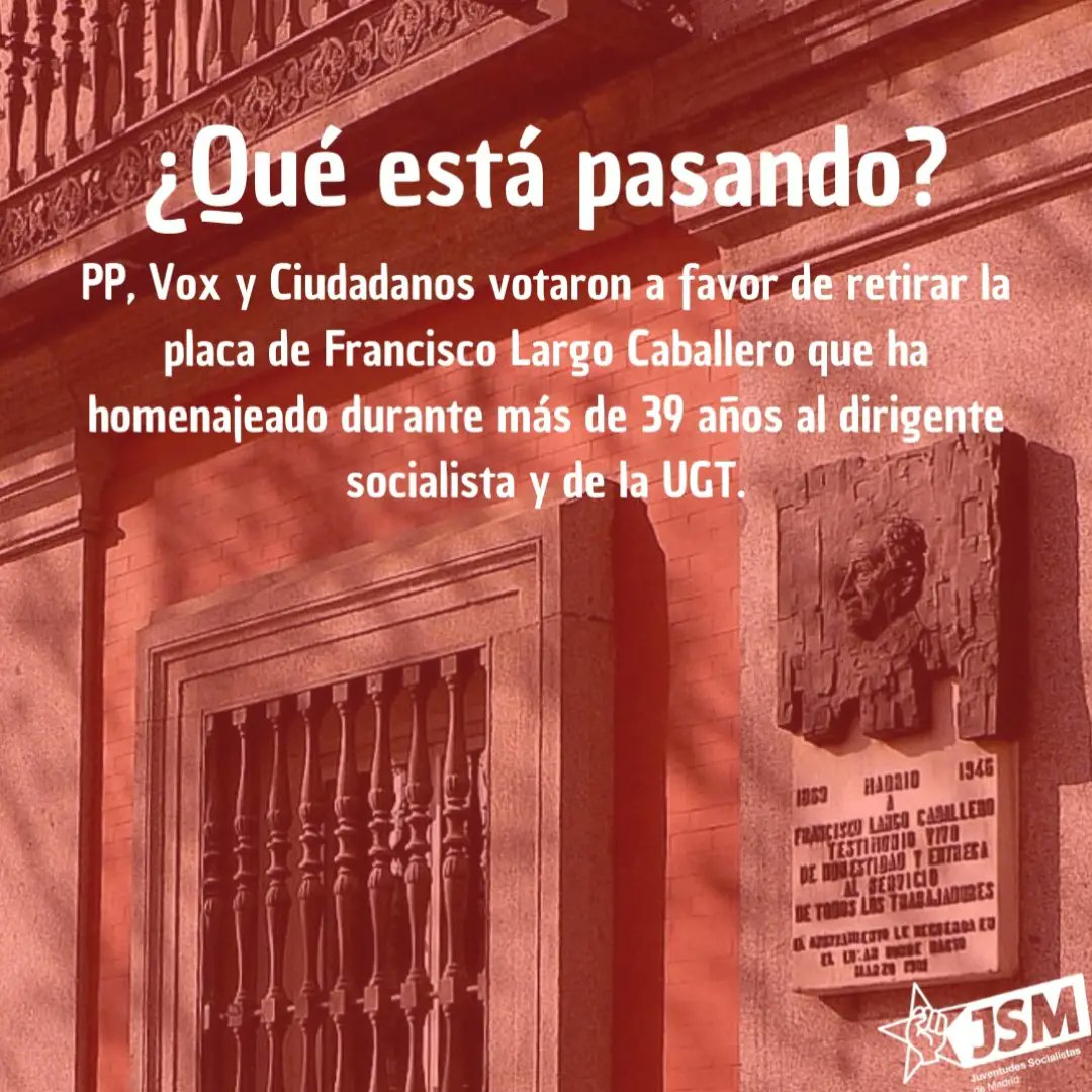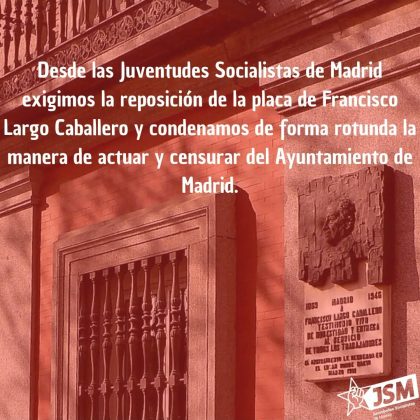 Desde Juventudes Socialistas de Madrid exigimos la reposición de la placa de Francisco Largo Caballero en el lugar que le corresponde, en la Plaza de Chamberí. Condenamos rotundamente la manera de actuar y censurar del Ayuntamiento de Madrid.