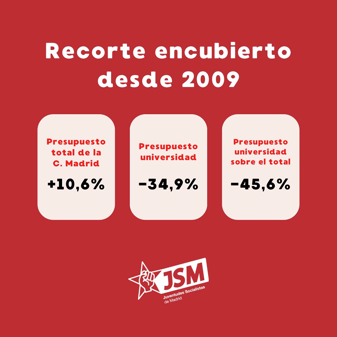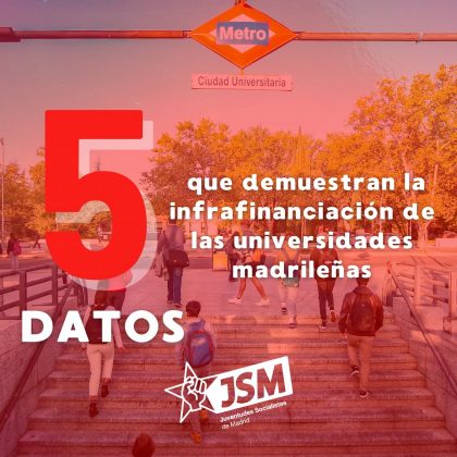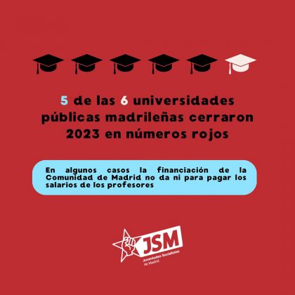 Campañas La universidad pública madrileña lucha por sobrevivir 19 de diciembre de 2024 FacebookTwitterPinterestWhatsAppLinkedinTelegram La universidad pública madrileña lucha por sobrevivir. Os dejamos 5 datos que demuestran los recortes y la infrafinanciación de las universidades en la Comunidad de Madrid Comparte estas publicaciones en nuestras redes sociales: Facebook Instagram 1 de 6